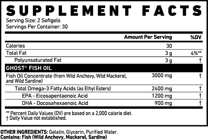Ghost Basics Fish Oil is a high-potency omega-3 formula designed for everyday use, delivering 2.4g total omega-3 fatty acids per serving in enteric-coated softgels for zero fishy aftertaste.
